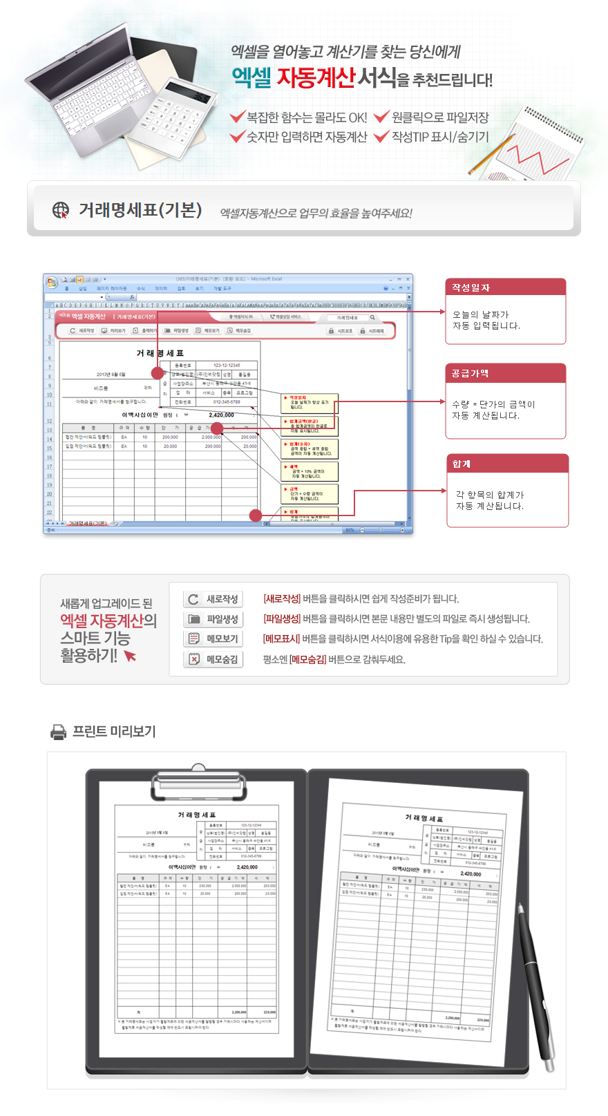 매입매출재고 통합관리 프로그램(일별현황, 월별현황, 거래처별현황, 상품별판매현황, 재고현황, 미지급미수금현황, 거래처원장, 견적서, 거래명세서, 세금계산서, 계산서)