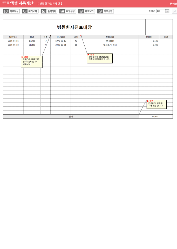 병원환자 진료대장입니다. 방문일자, 성명, 성별, 생년월일, 나이, 진료내용, 진료비 등으로 구성되어 있으며 환자 관리시 사용하시면 됩니다. 생년월일을 입력하시면 나이가 자동계산되는 엑셀자동계산 서식입니다.