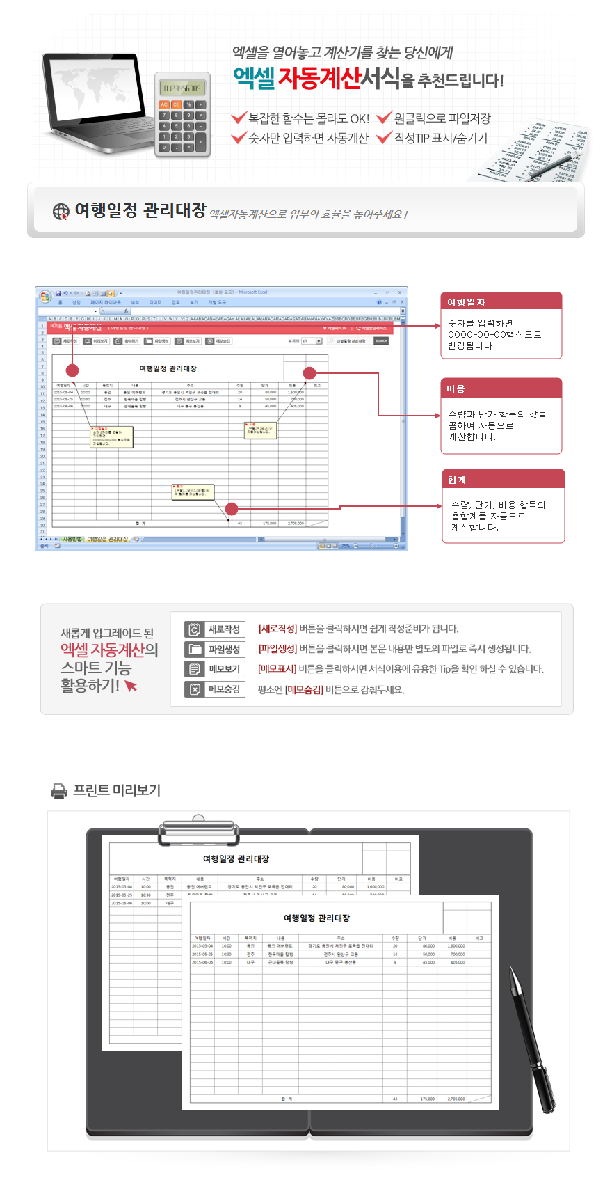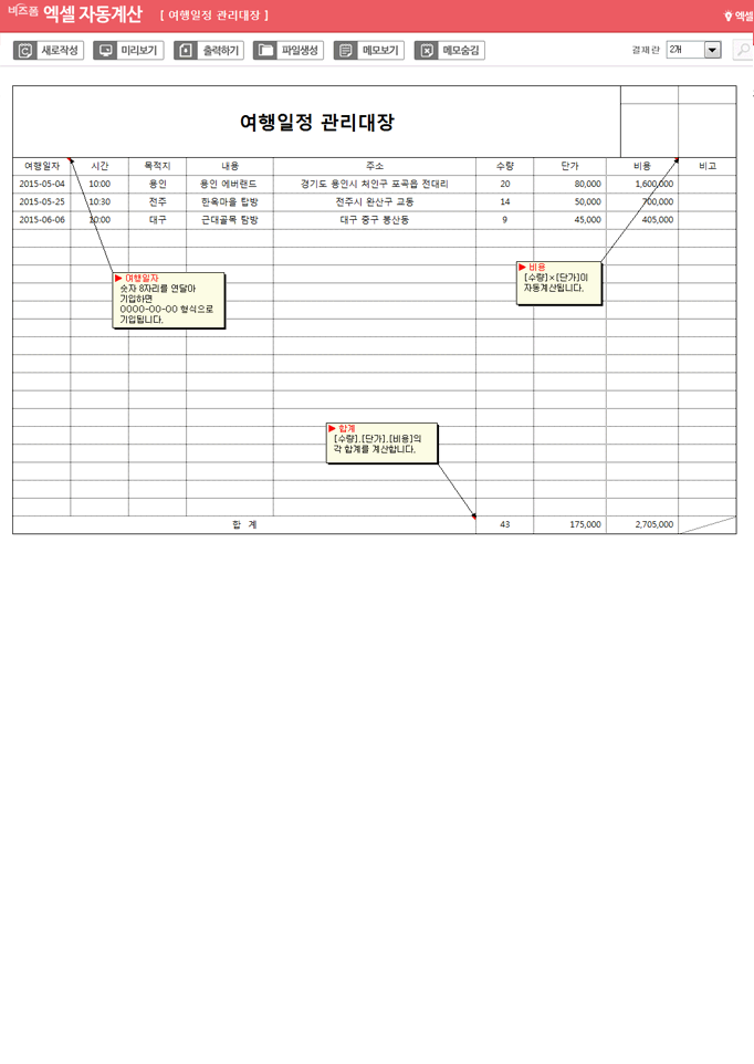 여행일정 관리대장입니다. 여행일자, 시간, 목적지, 내용, 주소, 수량, 단가, 비용 등으로 구성되어 있습니다. 수량과 단가를 입력하시면 비용이 자동계산되는 엑셀자동계산 서식입니다.