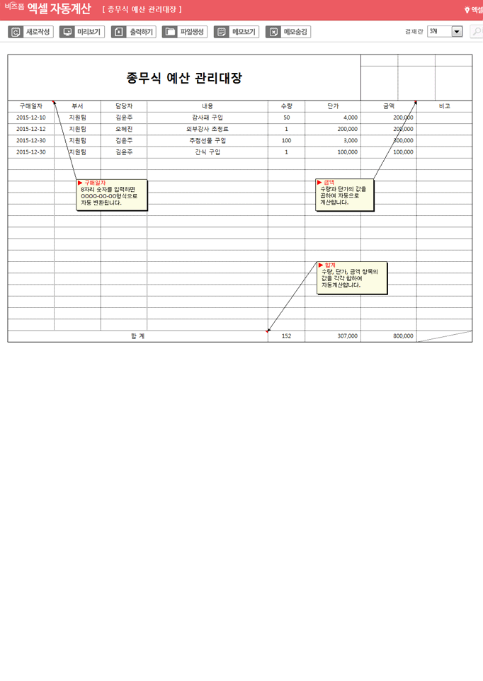 종무식예산 관리대장입니다. 구매일자, 부서, 담당자, 내용, 수량, 단가, 금액 등으로 구성되어 있습니다. 수량, 단가를 입력하시면 금액이 자동계산되는 엑셀자동계산 서식입니다.
