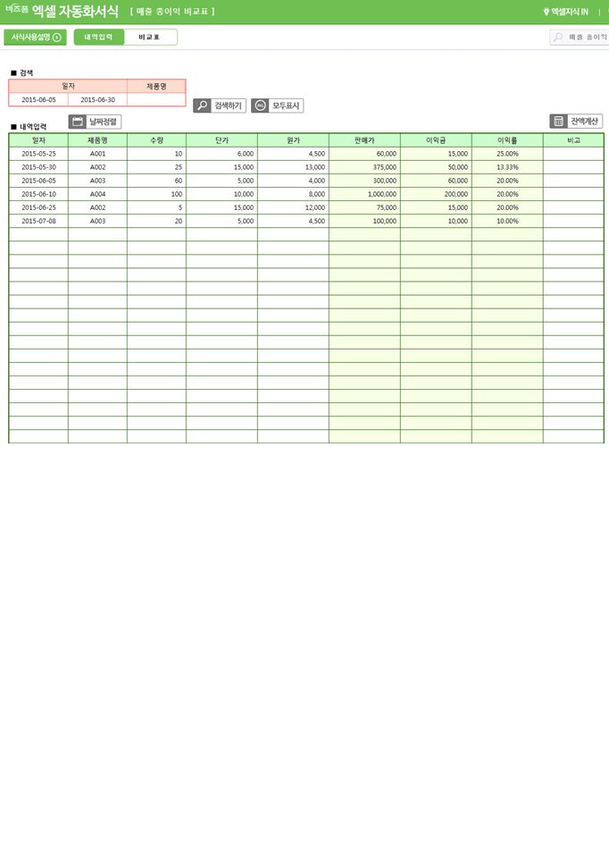 매출총이익 비교표입니다. 일자, 제품명, 수량, 단가, 원가을 입력할 수 있습니다. 내역을 입력하고 일자, 제품명으로 검색하여 출력할수 있는 엑셀자동화서식입니다.