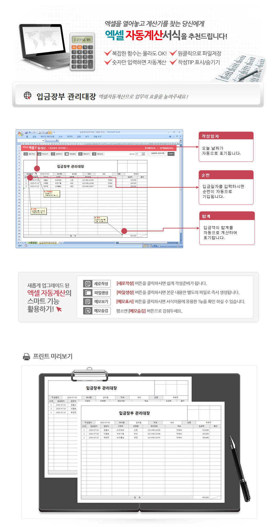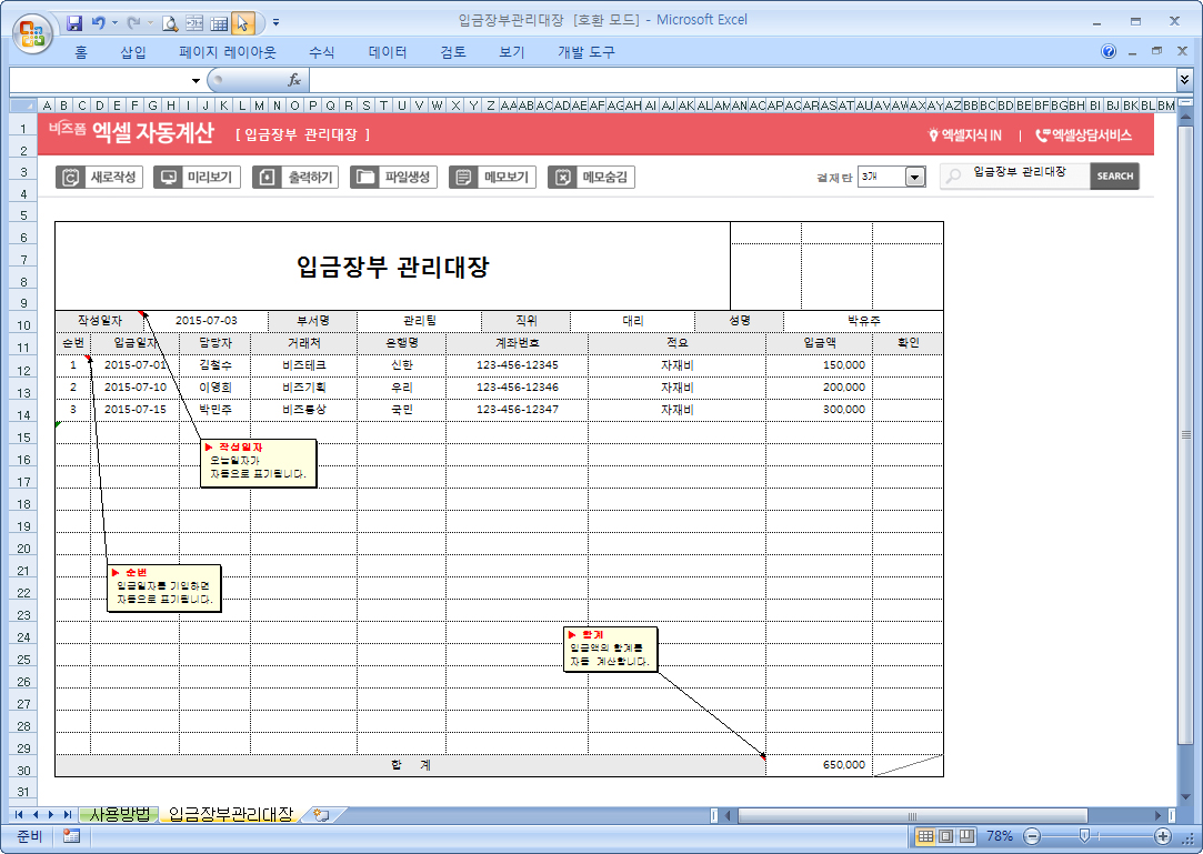 입금장부 관리대장입니다. 입금일자, 담당자, 거래처, 은행명, 계좌번호, 적요, 입금액 등으로 구성되어 있습니다. 입금액을 입력하시면 합계가 자동계산되는 엑셀자동계산 서식입니다.