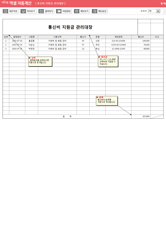통신비 지원금 관리대장입니다. 결제일자, 사원명, 사용내역, 통신사, 은행, 계좌번호, 통신비 등으로 구성되어 있습니다. 통신비를 입력하시면 합계가 자동계산되는 엑셀자동계산 서식입니다.
