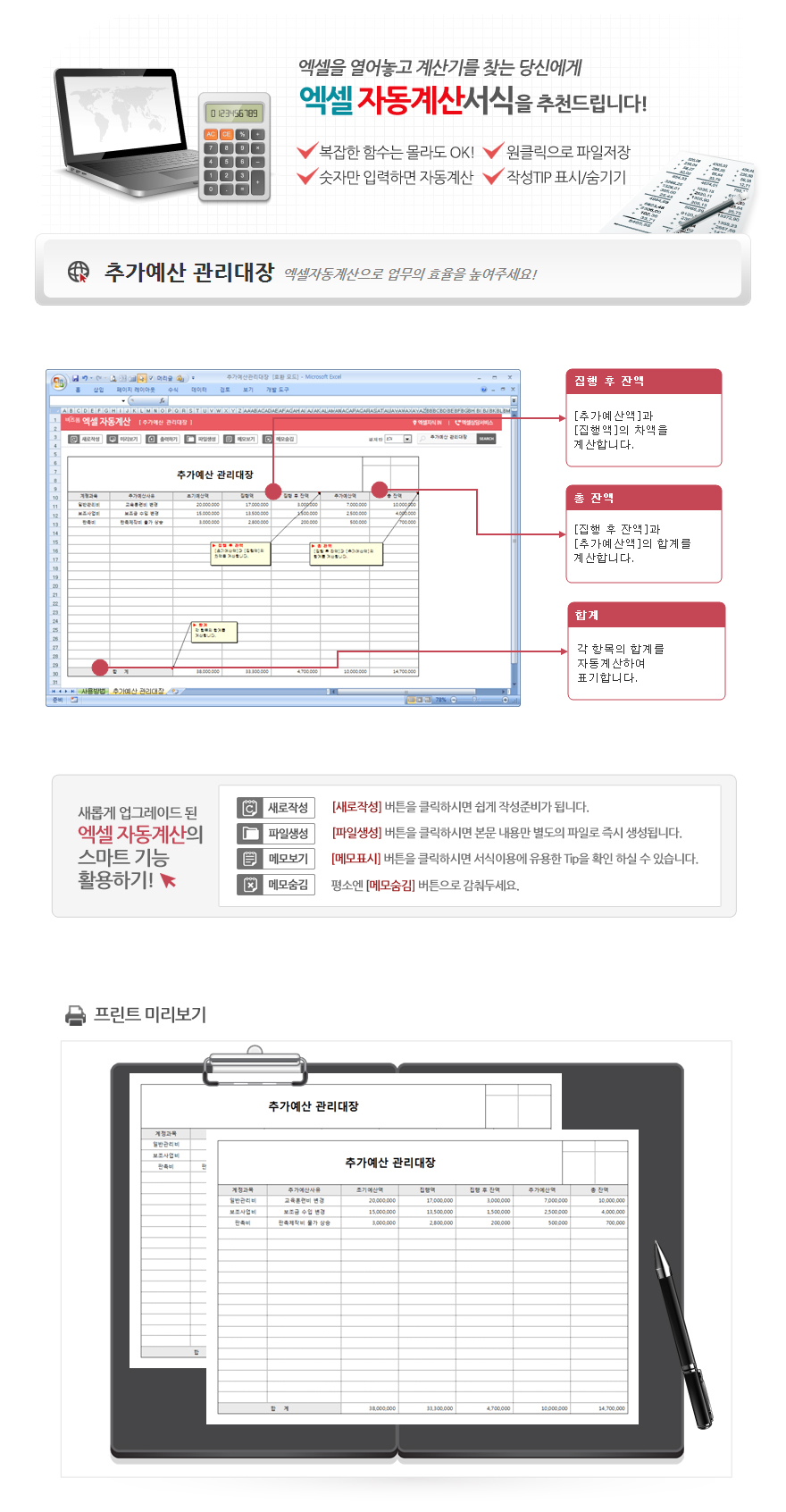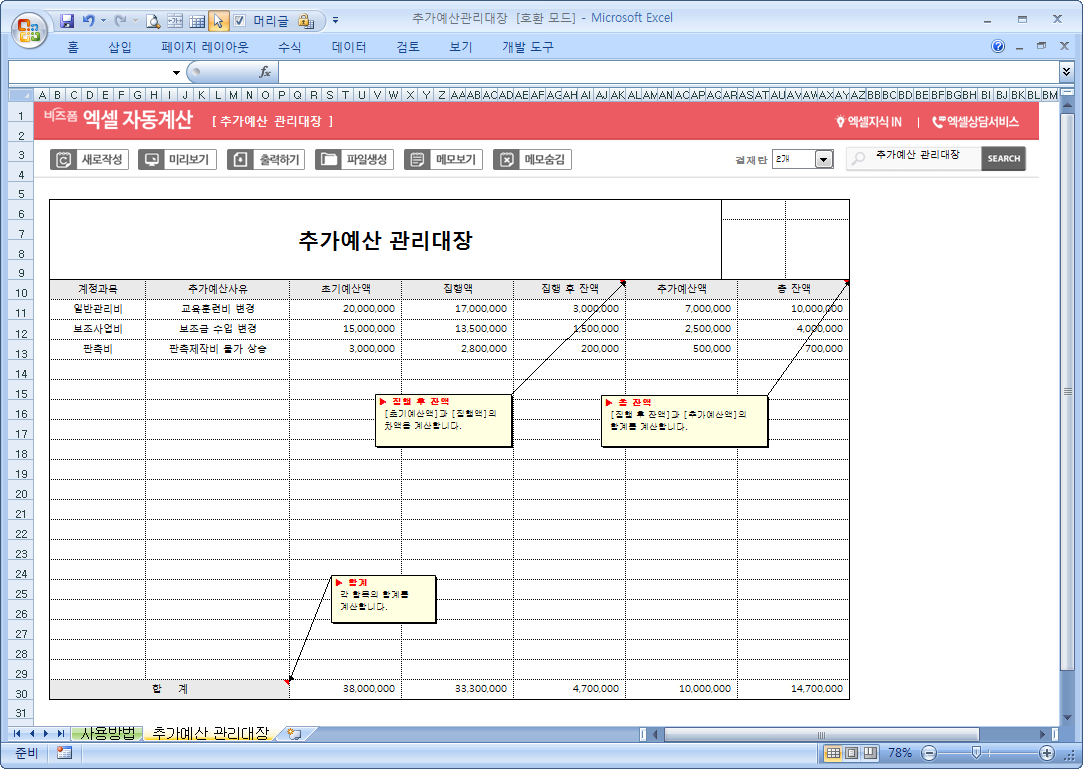 추가예산 관리대장입니다. 계정과목, 추가예산사유, 초기예산액, 집행액, 집행후잔액, 추가예산액, 총잔액 등으로 구성되어 있으며 각 금액을 입력하시면 합계가 자동계산되는 엑셀자동계산 서식입니다.