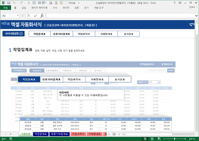 건설중장비 대여관리(렌탈관리, 내역서, 거래명세표, 총기성표) 프로그램입니다. 집계표 내역을 작성하고 관리할 수 있습니다. 각각의 내역을 작업내역서, 거래명세표, 총기성표 등의 형식으로 조회/출력할 수 있어 편리하게 사용할 수 있습니다. 출력페이지는 내역조회양에 따라 페이지가 자동출력됩니다. ※ 프로그램 규격 : MS오피스 엑셀 2003이상 ※ 프로그램 구성 : 작업집계표, 유류기타집계표, 작업내역서, 거래명세표, 총기성표