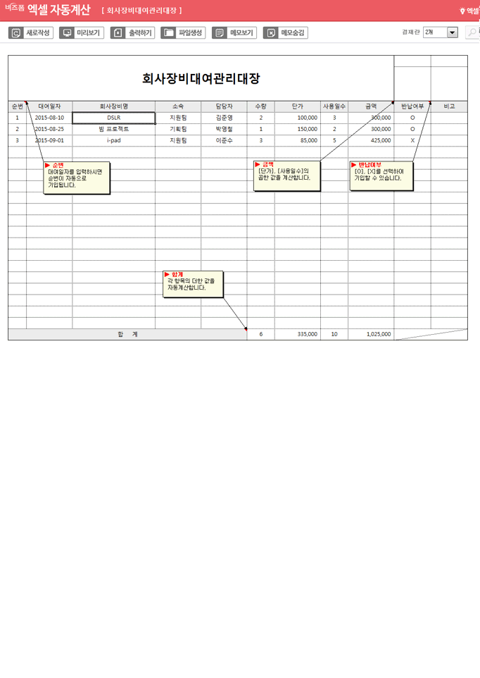 회사장비 대여관리대장입니다. 대여일자, 회사장비명, 소속, 담당자, 수량, 단가, 사용일수, 금액, 반납여부 등으로 구성되어 있으며 수량과 단가를 입력하시면 금액이 자동계산되는 엑셀자동계산 서식입니다.