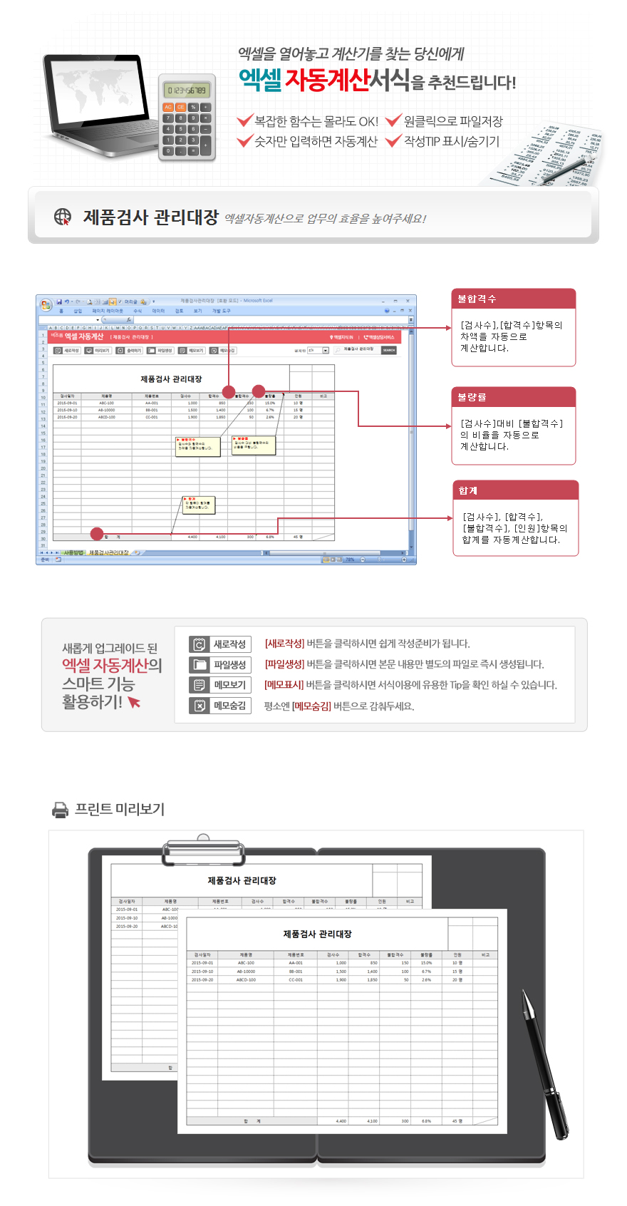 제품검사 관리대장입니다. 검사일자, 제품명, 제품번호, 검사수, 합격수, 불합격수, 불량률, 인원 등으로 구성되어 있으며 검사수와 합격수를 입력하시면 불합격수와 불량률이 자동계산되는 엑셀자동계산 서식입니다.