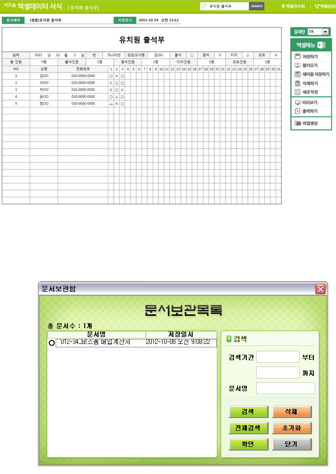 유치원 출석부입니다. 성명, 전화번호, 날짜별 출석현황 등을 입력할 수 있으며 총인원, 출석인원, 결석인원, 지각인원, 조퇴인원은 자동으로 계산됩니다. 이 서식은 작성 건별로 데이터 누적, 저장, 수정, 불러오기, 별도 파일로 저장이 가능한 엑셀 데이터 서식입니다.