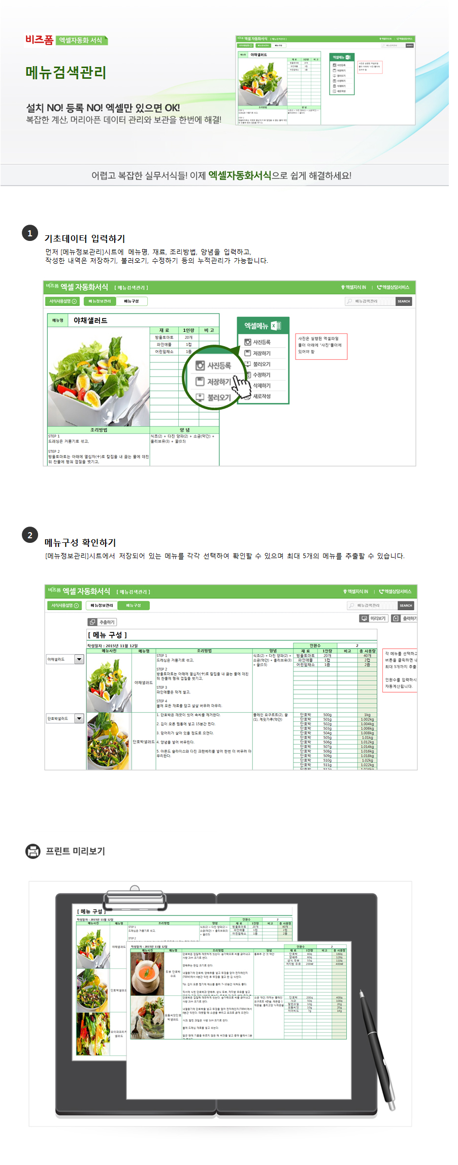 메뉴검색관리(도시락, 음식, 메뉴구성, 조리방법)입니다. 음식재료, 조리방법 등을 입력하면 메뉴구성을 한눈에 확인할 수 있으며, 입력한 내역은 저장하기, 불러오기, 수정하기등의 누적관리가 가능합니다. 메뉴별로 검색하여 조회/출력할 수 있는 엑셀자동화서식입니다. ※ 프로그램 규격 : MS오피스 엑셀 2007이상 ※ 프로그램 구성 : 메뉴정보관리, 메뉴구성 ※ 관련업종/분야 : 도시락, 음식, 메뉴구성, 메뉴관리, 조리방법, 음식재료, 양념, 식수량