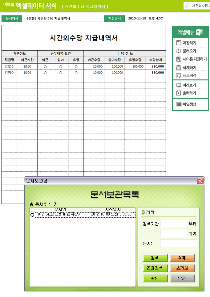 시간외수당 지급내역서입니다. 기본정보(직원명, 퇴근시간), 근무내역 확인(야근, 심야, 휴일), 수당정보(야근수당, 심야수당, 휴일수당, 수당합계) 등의 항목으로 구성되어 있습니다. 작성 건별로 데이터 누적, 저장, 수정, 불러오기, 별도 파일로 저장이 가능한 엑셀 데이터 서식입니다.