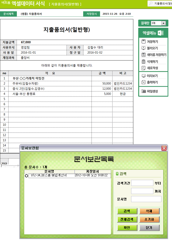 지불금액, 사용부서, 사용자, 사용일, 청구일, 계정과목, 적요, 금액 등의 항목으로 구성된 엑셀 데이터 서식으로 작성 건별 데이터 누적, 저장, 수정, 불러오기가 가능합니다.