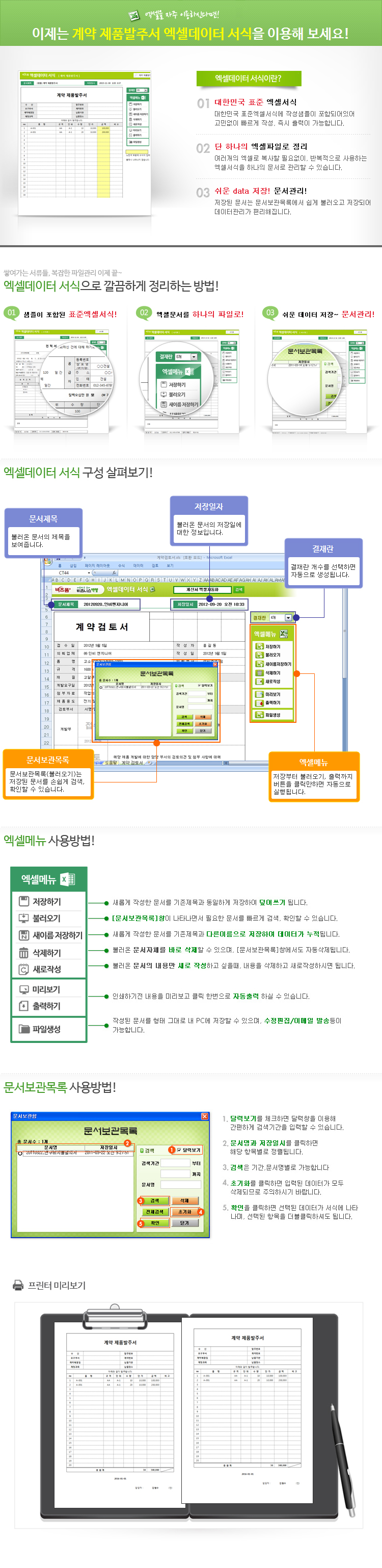 계약 제품발주서입니다. 수신, 요구부서, 계약체결일, 게정과목, 발주번호, 계약번호, 납품기한, 납품장소, 품명, 규격, 단위, 수량, 단가, 금액, 비고, 총합계, 작성일, 담당자 등의 항목으로 구성되어 있습니다. 작성 건별로 데이터 누적, 저장, 수정, 불러오기, 별도 파일로 저장이 가능한 엑셀 데이터 서식입니다.