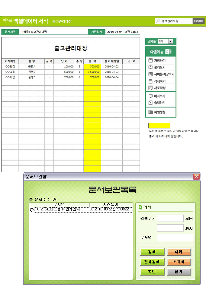 출고관리대장입니다. 거래처명, 품명, 규격, 단가, 수량, 총액, 출고예정일 등의 항목으로 구성되어 있습니다. 작성 건별로 데이터 누적, 저장, 수정, 불러오기, 별도 파일로 저장이 가능한 엑셀 데이터 서식입니다.