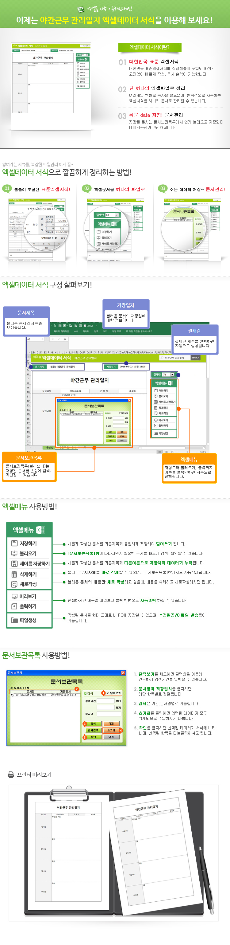 야간근무 관리일지입니다. 작성일자, 근무자, 작업내용, 특이사항, 전달사항 등의 항목으로 구성되어 있습니다. 작성 건별로 데이터 누적, 저장, 수정, 불러오기, 별도 파일로 저장이 가능한 엑셀 데이터 서식입니다.