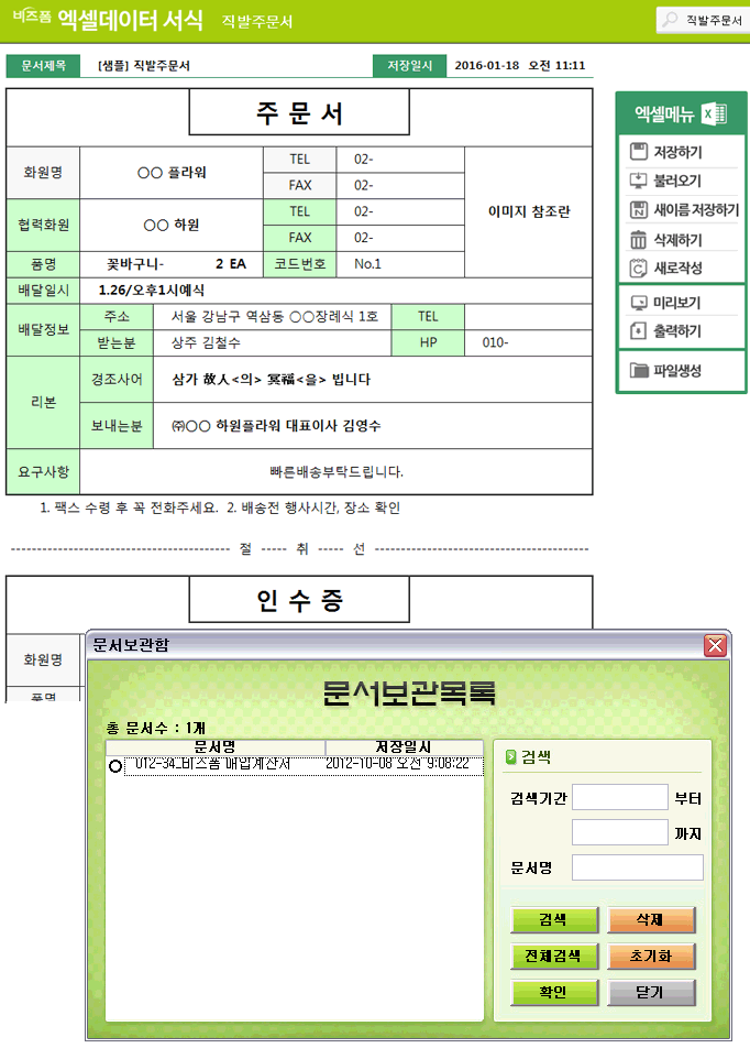 직발주문서 입니다. 주문서(화원명, 협력화원, 연락처, 품명, 코드번호, 배달일시, 배달정보, 리본, 요구사항), 인수증(화원명, 연락처, 품명, 코드번호, 배달일시, 배달정보, 리본, 인수인, 관계, 시간) 등의 항목으로 구성되어 있습니다. 작성 건별로 데이터 누적, 저장, 수정, 불러오기, 별도 파일로 저장이 가능한 엑셀 데이터 서식입니다.