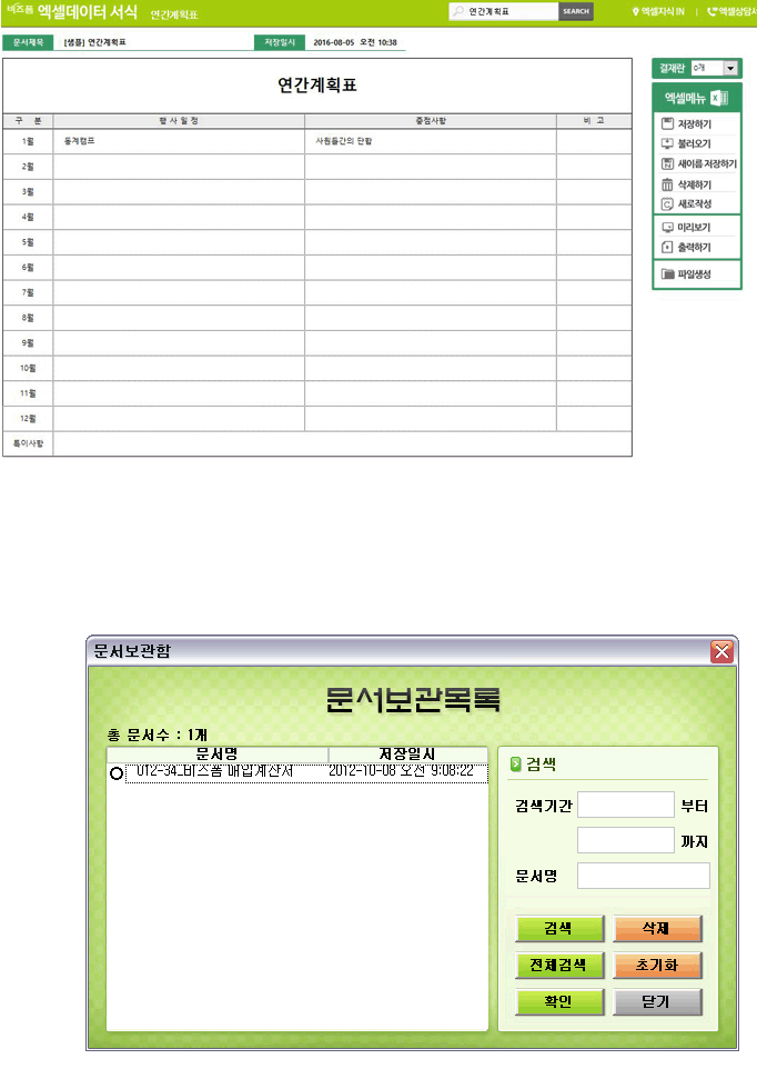 연간계획표 입니다. 구분(각 월), 행사일정, 중점사항, 비고 등의 항목으로 구성되어 있습니다. 작성 건별로 데이터 누적, 저장, 수정, 불러오기, 별도 파일로 저장이 가능한 엑셀 데이터 서식입니다.