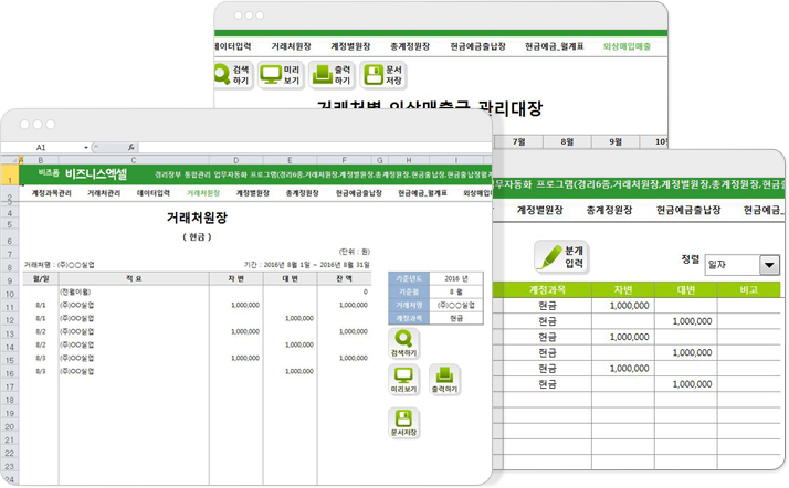 구성 : 계정과목관리,거래처관리,데이터입력,거래처원장,계정별원장,총계정원장,현금예금출납장,현금예금_월계표,외상매입매출경리장부 6종서식을 한번에 출력관리!경리장부 통합관리는 분개데이터를 입력하여 거래처원장 등 6종서식을 한번에 통합하여 관리할 수 있는 업무자동화 프로그램입니다.