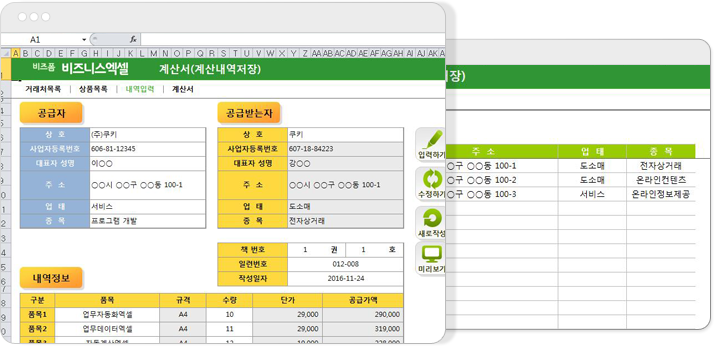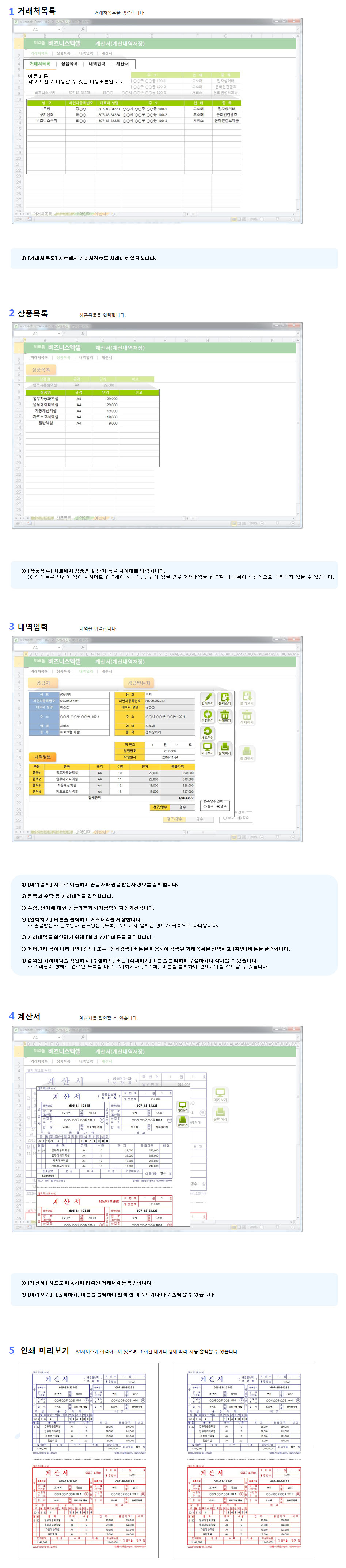 구성 : 거래처목록,상품목록,내역입력,계산서,세금계산서거래금액 자동계산과 출력을 간편하게!계산서는 거래처별 거래내역을 저장하여 검색을 통해 손쉽게 확인/관리할 수 있는 업무자동화 프로그램입니다.