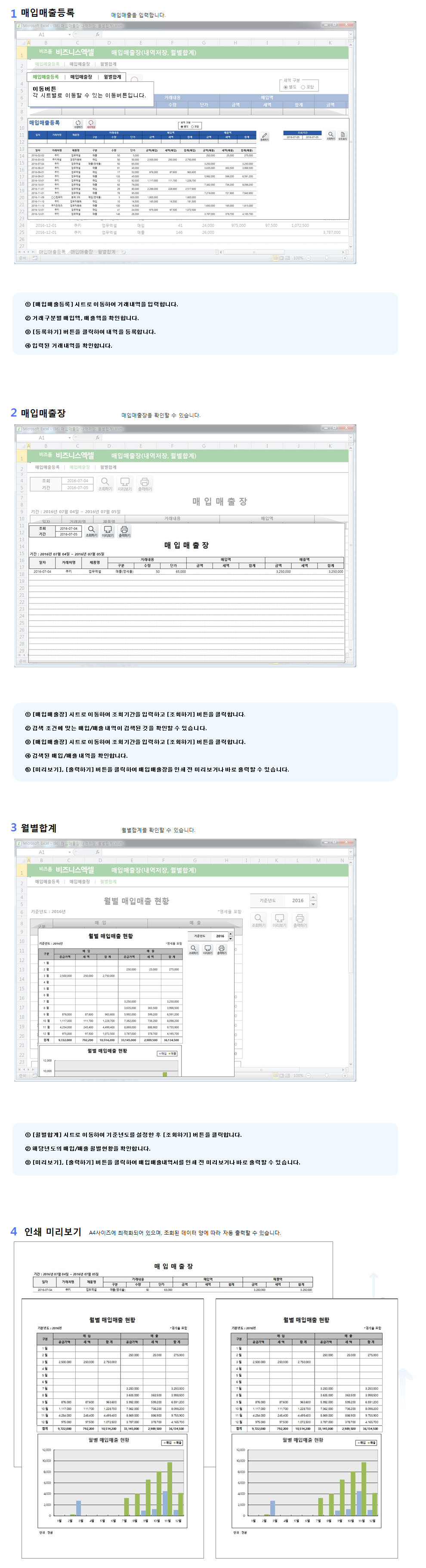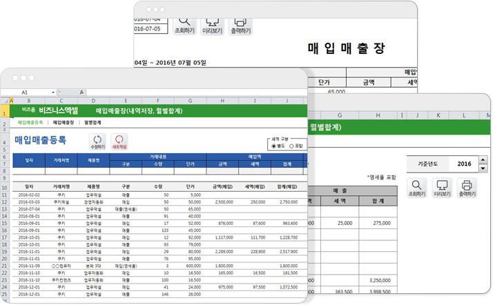 구성 : 내역입력,매입매출장,월별합계매입매출장과 월별합계를 한눈에!매입매출 통합관리는 거래내역을 매입과 매출로 구분하여 해당 기준연도를 선택하여 월별 매입매출의 현황을 확인/출력할 수 있는 업무자동화 프로그램입니다.