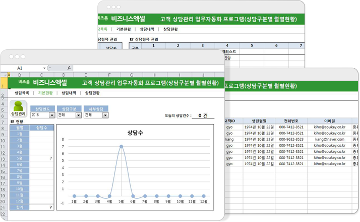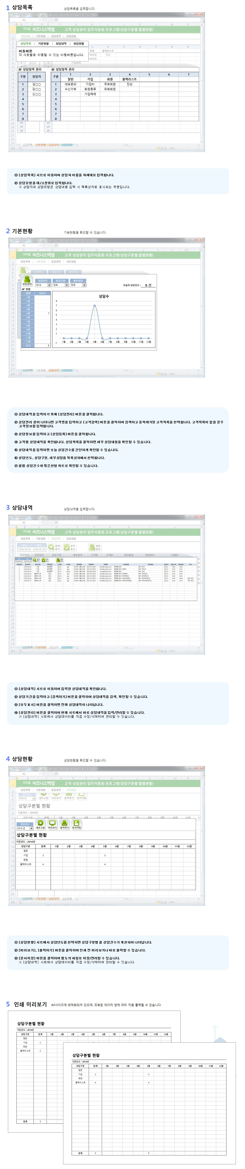 구성 : 상담목록,기본현황,상담내역,상담현황상담내역과 현황을 간편하게 관리!고객 상담관리는 상담유형을 월단위로 구분하여 상담현황을 파악하거나 세부상담을 관리할 수 있는 업무자동화 프로그램입니다.