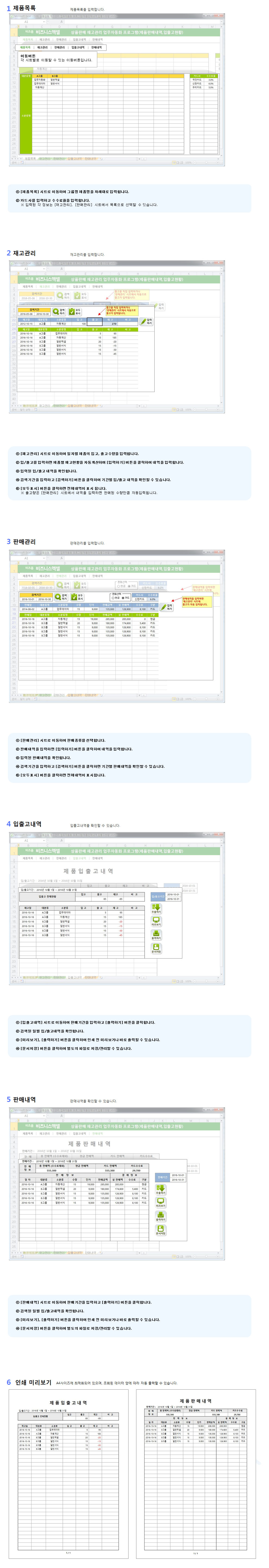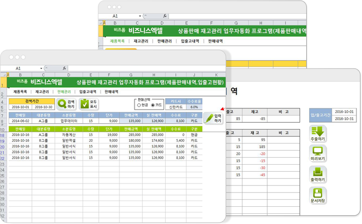 구성 : 제품목록,재고관리,판매관리,입출고내역,판매내역판매내역과 재고관리를 한번에!상품판매 재고관리는 제품별 입/출고내역의 저장관리하여 일자별, 제품별 현황을 확인/관리할 수 있는 업무자동화 프로그램입니다.