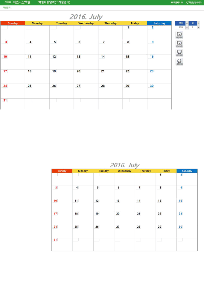 구성 : 엑셀달력달력형으로 일정관리를 간편하게!스케쥴관리는 달력폼을 이용하여 스케쥴을 저장관리하여 연도와 월의 선택만으로 간편하게 확인/출력할 수 있는 업무자동화 프로그램입니다.