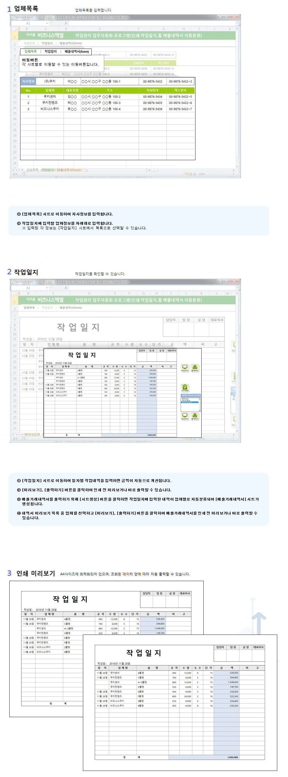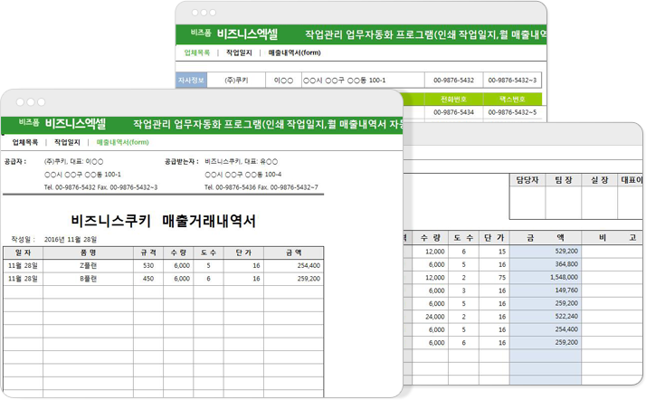 구성 : 매출내역서(form),작업일지,업체목록작업일지와 매출내역서를 한번에!작업관리는 업체별 작업내역을 자동으로 분류하여 업체별로 매출내역서 시트를 생성/출력할 수 있는 업무자동화 프로그램입니다.