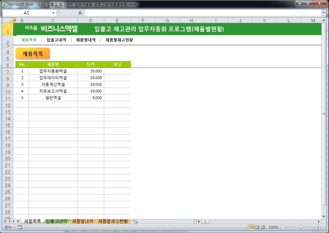 구성 : 제품목록,입출고내역,제품별내역,제품별재고현황입출고내역서와 제품현황표를 한번에 확인!입출고 재고관리는 입/출고내역의 재고를 자동으로 계산하여 원하는 기간의 내역서를 자동추출하고 제품별로 현황을 확인/출력할 수 있는 업무자동화 프로그램입니다.