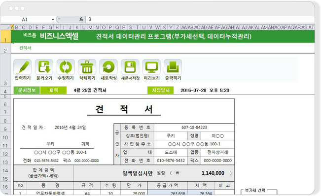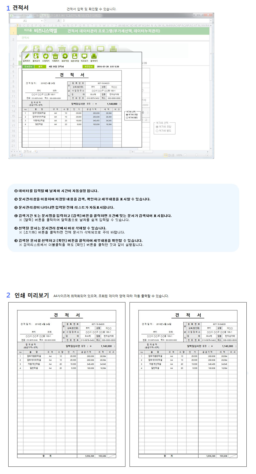 ■ 견적서 데이터를 한곳에서 관리하는 업무자동화1. 반복적으로 입력하고 출력하는 업무를 저장/관리할 수 있습니다.2. 검색을 통하여 원하는 데이터를 불러와서 확인할 수 있습니다.3. 버튼 클릭으로 서식을 미리보거나 출력할 수 있습니다.4. 견적서를 새로운 파일로 저장하여 관리하거나 메일로 보낼 수 있습니다.