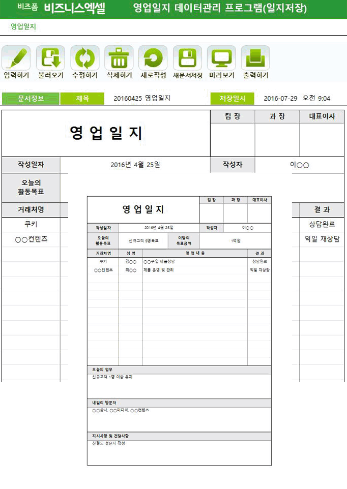 구성 : 영업일지■ 영업일지 데이터를 한곳에서 관리하는 업무자동화1. 반복적으로 입력하고 출력하는 업무를 저장/관리할 수 있습니다.2. 검색을 통하여 원하는 데이터를 불러와서 확인할 수 있습니다.3. 버튼 클릭으로 서식을 미리보거나 출력할 수 있습니다.4. 영업일지를 새로운 파일로 저장하여 관리하거나 메일로 보낼 수 있습니다.
