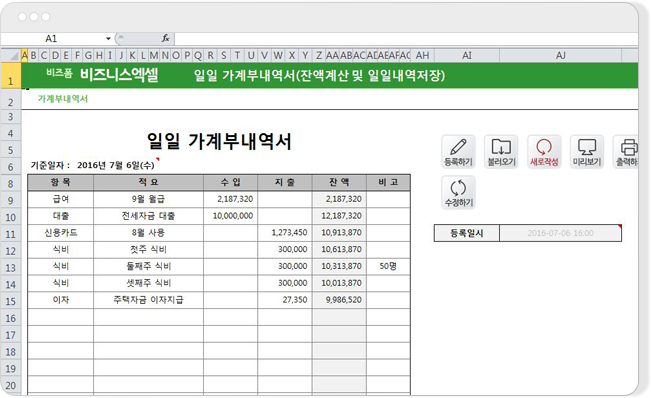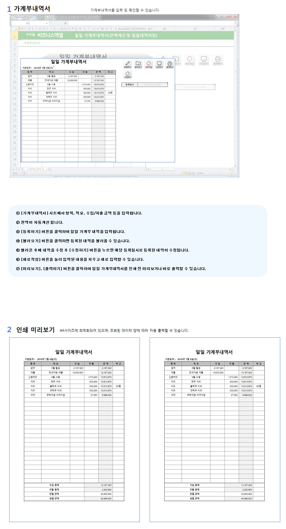 구성 : 가계부내역서■ 일일 가계부내역서 데이터를 한곳에서 관리하는 업무자동화1. 반복적으로 입력하고 출력하는 업무를 저장/관리할 수 있습니다.2. 검색을 통하여 원하는 데이터를 불러와서 확인할 수 있습니다.3. 버튼 클릭으로 서식을 미리보거나 출력할 수 있습니다.4. 일일 가계부내역서를 새로운 파일로 저장하여 관리하거나 메일로 보낼 수 있습니다.
