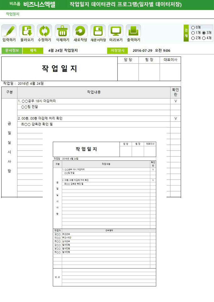 구성 : 작업일지■ 작업일지 데이터를 한곳에서 관리하는 업무자동화1. 반복적으로 입력하고 출력하는 업무를 저장/관리할 수 있습니다.2. 검색을 통하여 원하는 데이터를 불러와서 확인할 수 있습니다.3. 버튼 클릭으로 서식을 미리보거나 출력할 수 있습니다.4. 작업일지를 새로운 파일로 저장하여 관리하거나 메일로 보낼 수 있습니다.