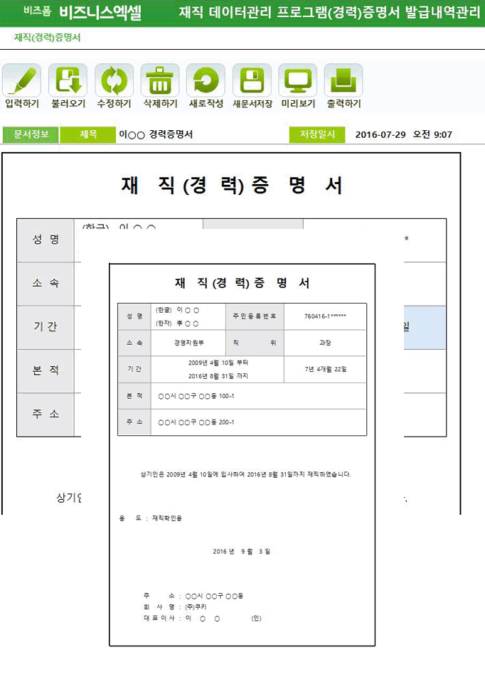 구성 : 재직(경력)증명서■ 재직 데이터를 한곳에서 관리하는 업무자동화1. 반복적으로 입력하고 출력하는 업무를 저장/관리할 수 있습니다.2. 검색을 통하여 원하는 데이터를 불러와서 확인할 수 있습니다.3. 버튼 클릭으로 서식을 미리보거나 출력할 수 있습니다.4. 재직을 새로운 파일로 저장하여 관리하거나 메일로 보낼 수 있습니다.
