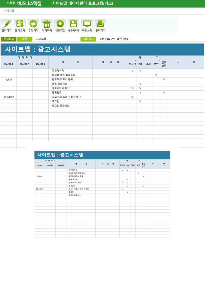 구성 : 사이트맵■ 사이트맵 데이터를 한곳에서 관리하는 업무자동화1. 반복적으로 입력하고 출력하는 업무를 저장/관리할 수 있습니다.2. 검색을 통하여 원하는 데이터를 불러와서 확인할 수 있습니다.3. 버튼 클릭으로 서식을 미리보거나 출력할 수 있습니다.4. 사이트맵을 새로운 파일로 저장하여 관리하거나 메일로 보낼 수 있습니다.