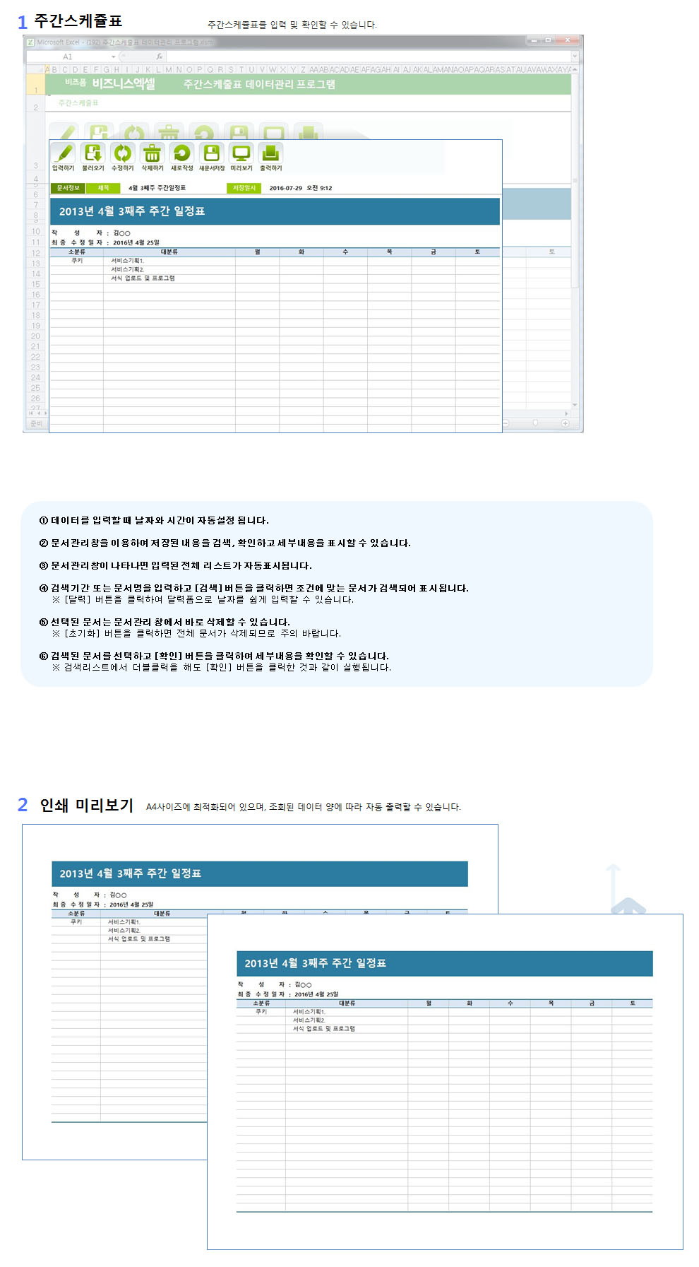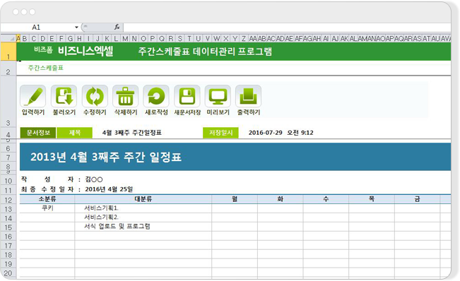 구성 : 주간스케줄표■ 주간스케줄표 데이터를 한곳에서 관리하는 업무자동화1. 반복적으로 입력하고 출력하는 업무를 저장/관리할 수 있습니다.2. 검색을 통하여 원하는 데이터를 불러와서 확인할 수 있습니다.3. 버튼 클릭으로 서식을 미리보거나 출력할 수 있습니다.4. 주간스케줄표를 새로운 파일로 저장하여 관리하거나 메일로 보낼 수 있습니다.