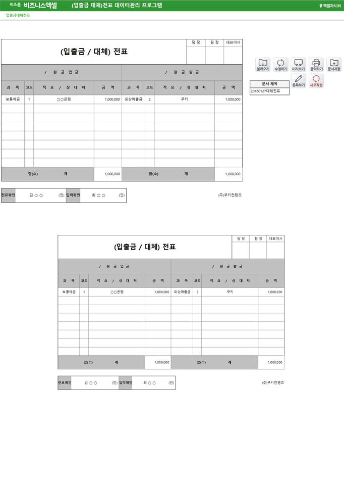 구성 : (입출금대체)전표■ (입출금 대체)전표 데이터를 한곳에서 관리하는 업무자동화1. 반복적으로 입력하고 출력하는 업무를 저장/관리할 수 있습니다.2. 검색을 통하여 원하는 데이터를 불러와서 확인할 수 있습니다.3. 버튼 클릭으로 서식을 미리보거나 출력할 수 있습니다.4. (입출금 대체)전표를 새로운 파일로 저장하여 관리하거나 메일로 보낼 수 있습니다.