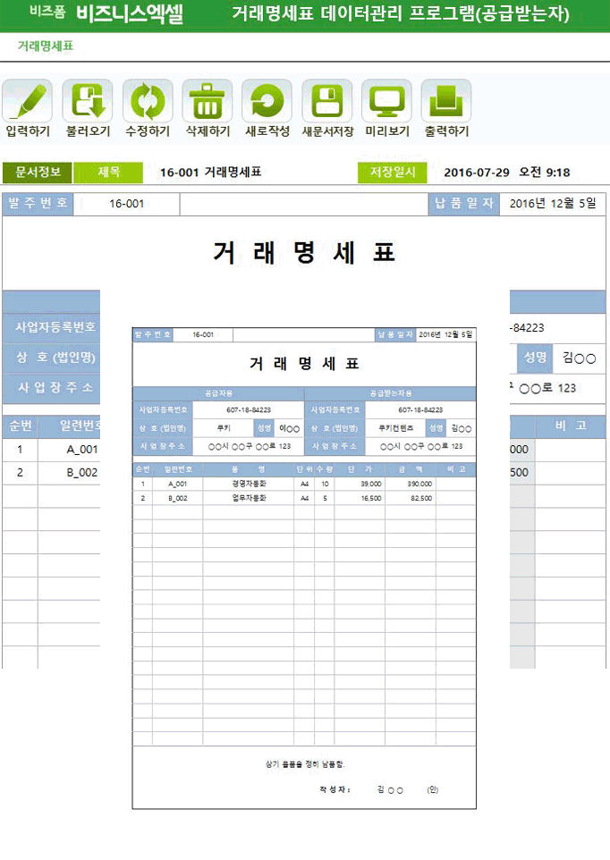 구성 : 거래명세표■ 거래명세표 데이터를 한곳에서 관리하는 업무자동화1. 반복적으로 입력하고 출력하는 업무를 저장/관리할 수 있습니다.2. 검색을 통하여 원하는 데이터를 불러와서 확인할 수 있습니다.3. 버튼 클릭으로 서식을 미리보거나 출력할 수 있습니다.4. 거래명세표를 새로운 파일로 저장하여 관리하거나 메일로 보낼 수 있습니다.