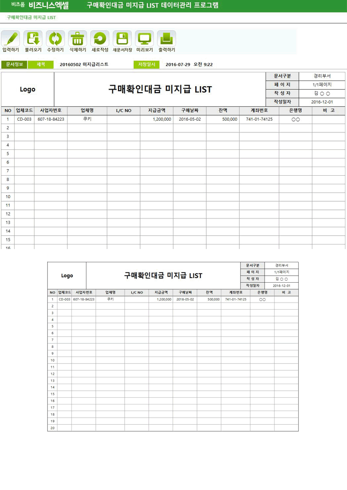 구성 : 구매확인대금 미지급 LIST■ 구매확인대금 미지급 LIST 데이터를 한곳에서 관리하는 업무자동화1. 반복적으로 입력하고 출력하는 업무를 저장/관리할 수 있습니다.2. 검색을 통하여 원하는 데이터를 불러와서 확인할 수 있습니다.3. 버튼 클릭으로 서식을 미리보거나 출력할 수 있습니다.4. 구매확인대금 미지급 LIST을 새로운 파일로 저장하여 관리하거나 메일로 보낼 수 있습니다.