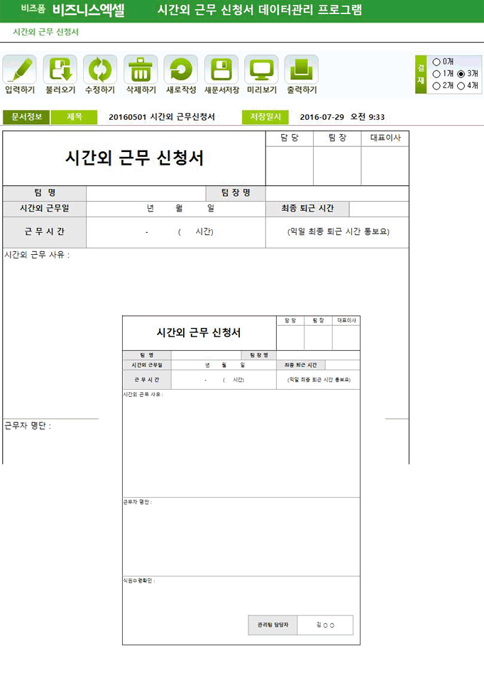구성 : 시간외 근무 신청서■ 시간외 근무 신청서 데이터를 한곳에서 관리하는 업무자동화1. 반복적으로 입력하고 출력하는 업무를 저장/관리할 수 있습니다.2. 검색을 통하여 원하는 데이터를 불러와서 확인할 수 있습니다.3. 버튼 클릭으로 서식을 미리보거나 출력할 수 있습니다.4. 시간외 근무 신청서를 새로운 파일로 저장하여 관리하거나 메일로 보낼 수 있습니다.
