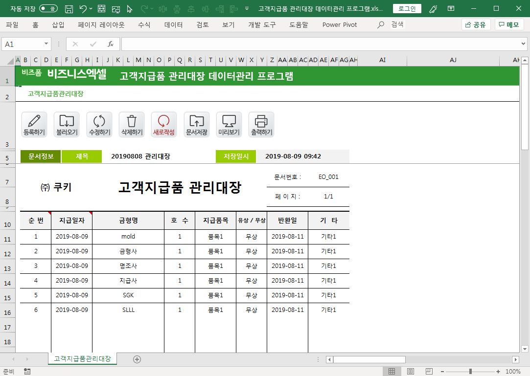 구성 : 고객지급품관리대장■ 고객지급품 관리대장 데이터를 한곳에서 관리하는 업무자동화1. 반복적으로 입력하고 출력하는 업무를 저장/관리할 수 있습니다.2. 검색을 통하여 원하는 데이터를 불러와서 확인할 수 있습니다.3. 버튼 클릭으로 서식을 미리보거나 출력할 수 있습니다.4. 고객지급품 관리대장을 새로운 파일로 저장하여 관리하거나 메일로 보낼 수 있습니다.