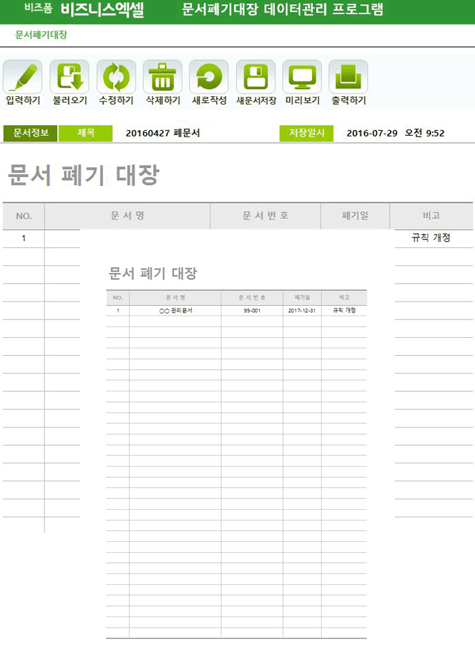 구성 : 문서폐기대장■ 문서폐기대장 데이터를 한곳에서 관리하는 업무자동화1. 반복적으로 입력하고 출력하는 업무를 저장/관리할 수 있습니다.2. 검색을 통하여 원하는 데이터를 불러와서 확인할 수 있습니다.3. 버튼 클릭으로 서식을 미리보거나 출력할 수 있습니다.4. 문서폐기대장을 새로운 파일로 저장하여 관리하거나 메일로 보낼 수 있습니다.