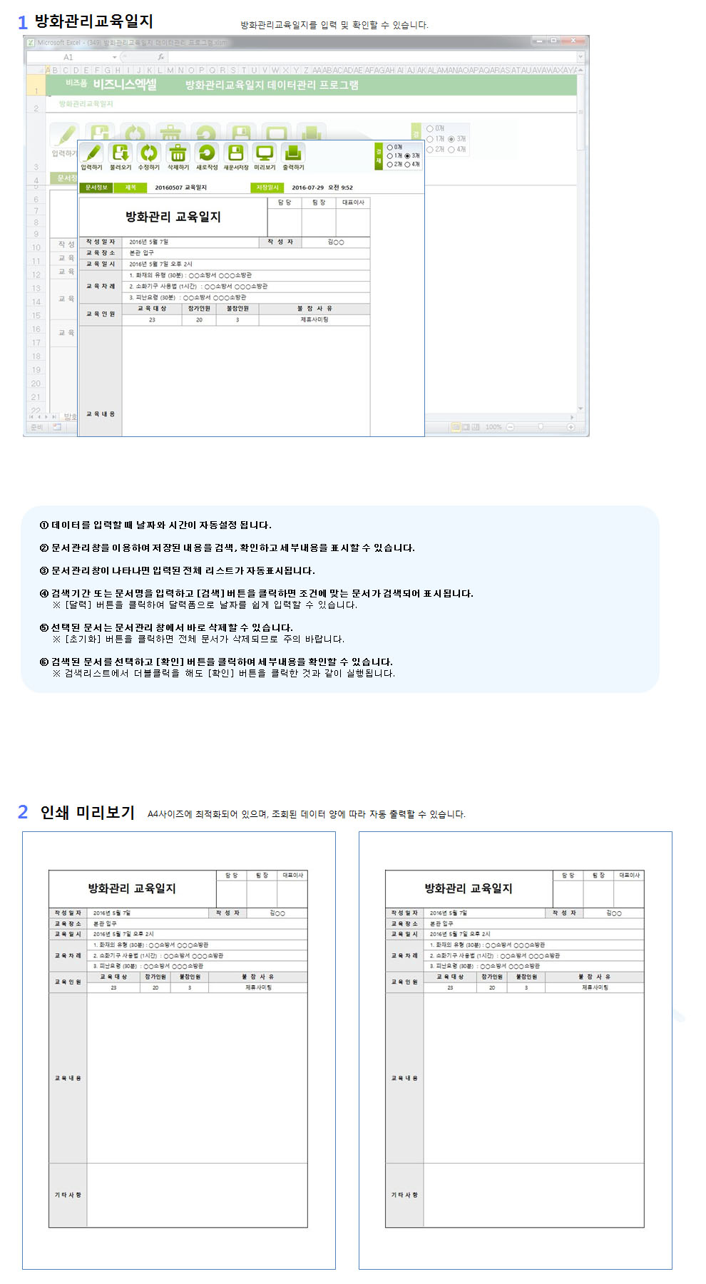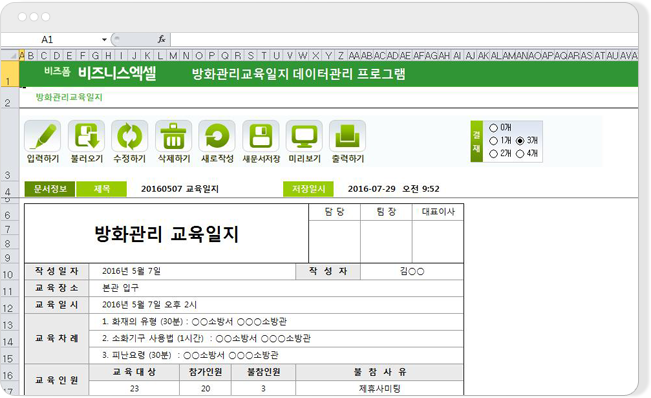 구성 : 방화관리교육일지■ 방화관리교육일지 데이터를 한곳에서 관리하는 업무자동화1. 반복적으로 입력하고 출력하는 업무를 저장/관리할 수 있습니다.2. 검색을 통하여 원하는 데이터를 불러와서 확인할 수 있습니다.3. 버튼 클릭으로 서식을 미리보거나 출력할 수 있습니다.4. 방화관리교육일지를 새로운 파일로 저장하여 관리하거나 메일로 보낼 수 있습니다.