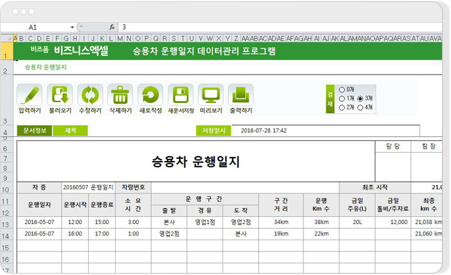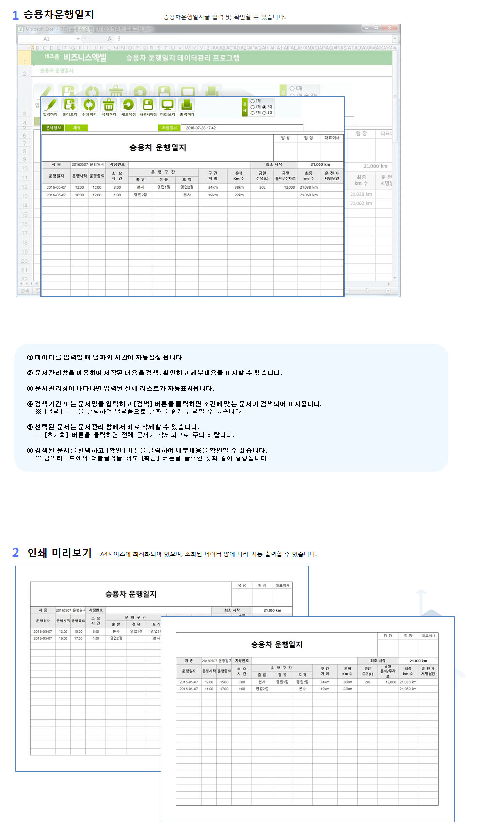 구성 : 승용차 운행일지■ 승용차 운행일지 데이터를 한곳에서 관리하는 업무자동화1. 반복적으로 입력하고 출력하는 업무를 저장/관리할 수 있습니다.2. 검색을 통하여 원하는 데이터를 불러와서 확인할 수 있습니다.3. 버튼 클릭으로 서식을 미리보거나 출력할 수 있습니다.4. 승용차 운행일지를 새로운 파일로 저장하여 관리하거나 메일로 보낼 수 있습니다.