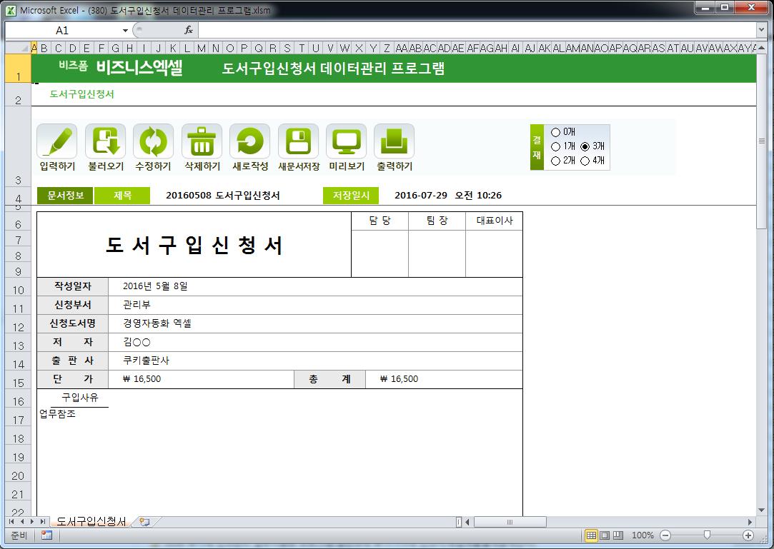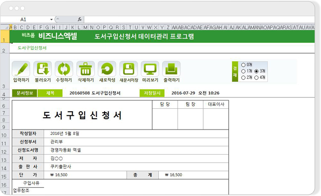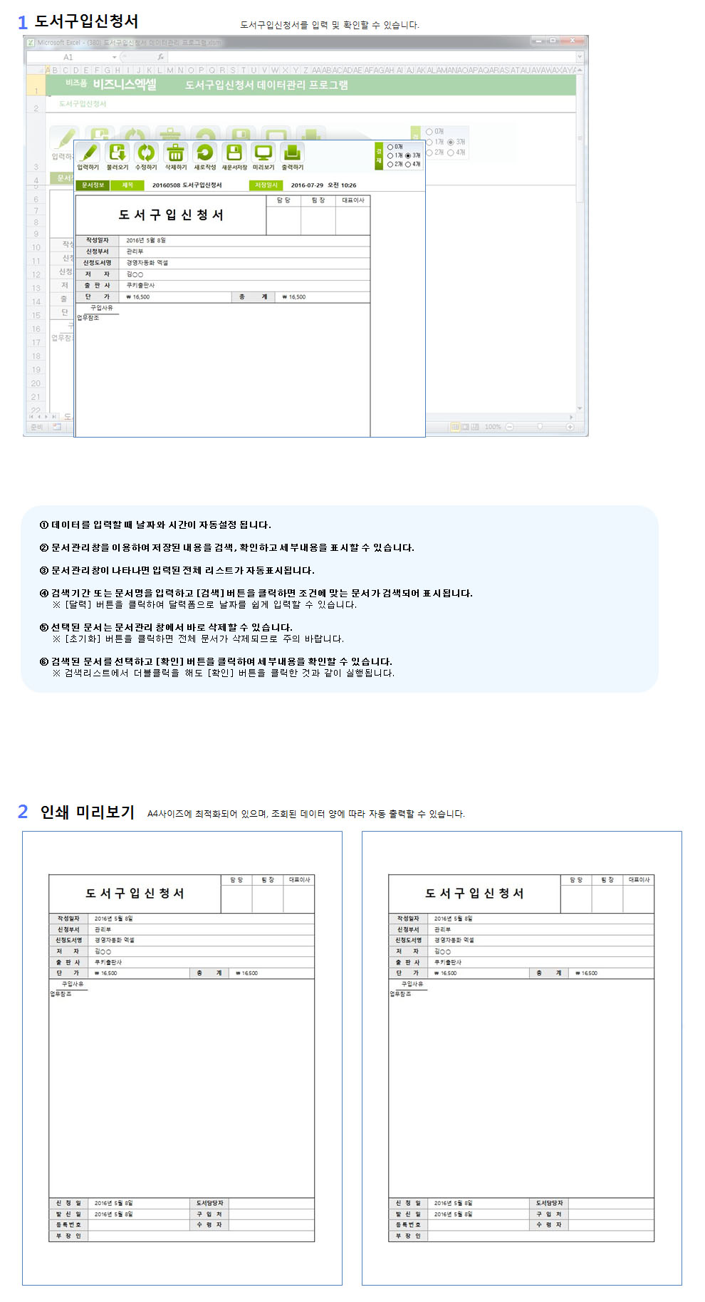 구성 : 도서구입신청서■ 도서구입신청서 데이터를 한곳에서 관리하는 업무자동화1. 반복적으로 입력하고 출력하는 업무를 저장/관리할 수 있습니다.2. 검색을 통하여 원하는 데이터를 불러와서 확인할 수 있습니다.3. 버튼 클릭으로 서식을 미리보거나 출력할 수 있습니다.4. 도서구입신청서를 새로운 파일로 저장하여 관리하거나 메일로 보낼 수 있습니다.