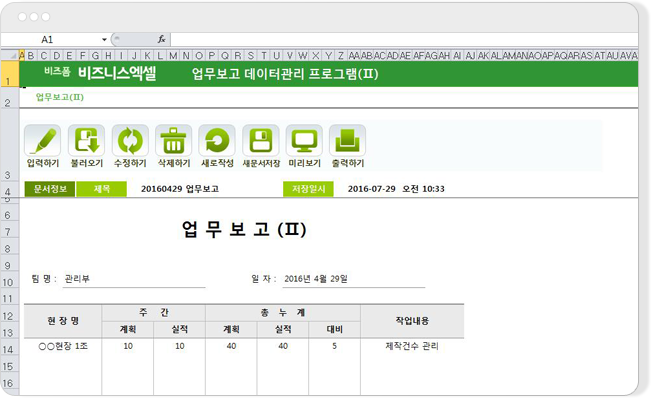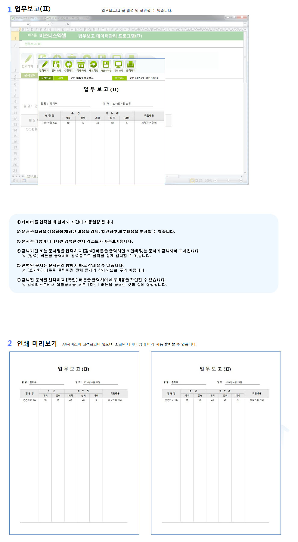 구성 : 업무보고(Ⅱ)■ 업무보고 데이터를 한곳에서 관리하는 업무자동화1. 반복적으로 입력하고 출력하는 업무를 저장/관리할 수 있습니다.2. 검색을 통하여 원하는 데이터를 불러와서 확인할 수 있습니다.3. 버튼 클릭으로 서식을 미리보거나 출력할 수 있습니다.4. 업무보고를 새로운 파일로 저장하여 관리하거나 메일로 보낼 수 있습니다.