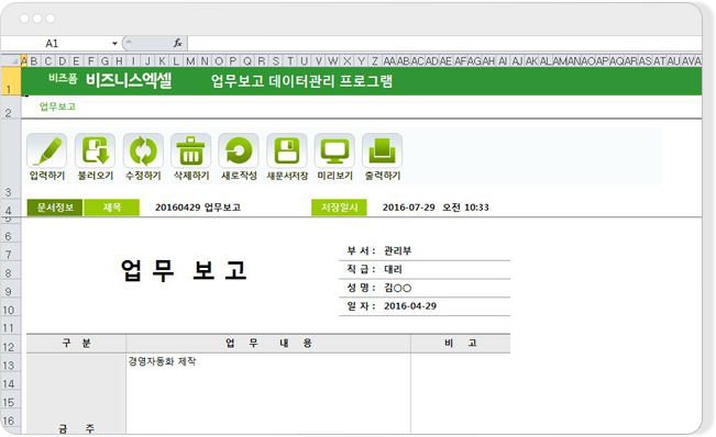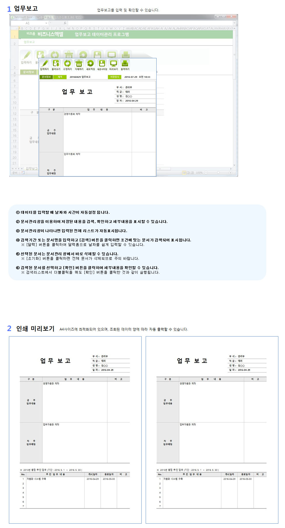 구성 : 업무보고(Ⅰ)■ 업무보고 데이터를 한곳에서 관리하는 업무자동화1. 반복적으로 입력하고 출력하는 업무를 저장/관리할 수 있습니다.2. 검색을 통하여 원하는 데이터를 불러와서 확인할 수 있습니다.3. 버튼 클릭으로 서식을 미리보거나 출력할 수 있습니다.4. 업무보고를 새로운 파일로 저장하여 관리하거나 메일로 보낼 수 있습니다.