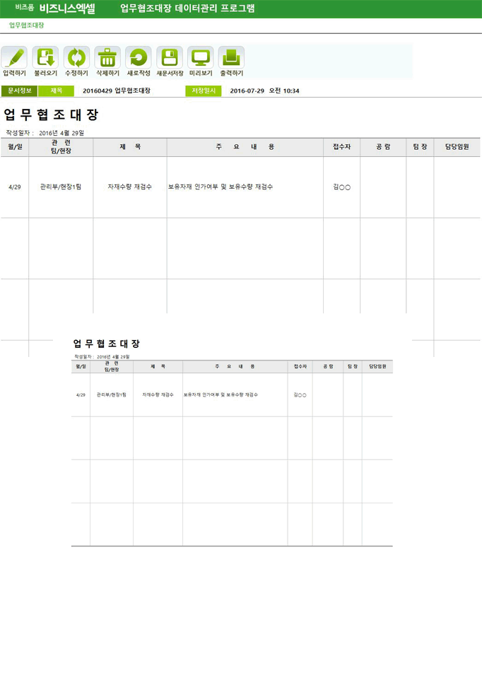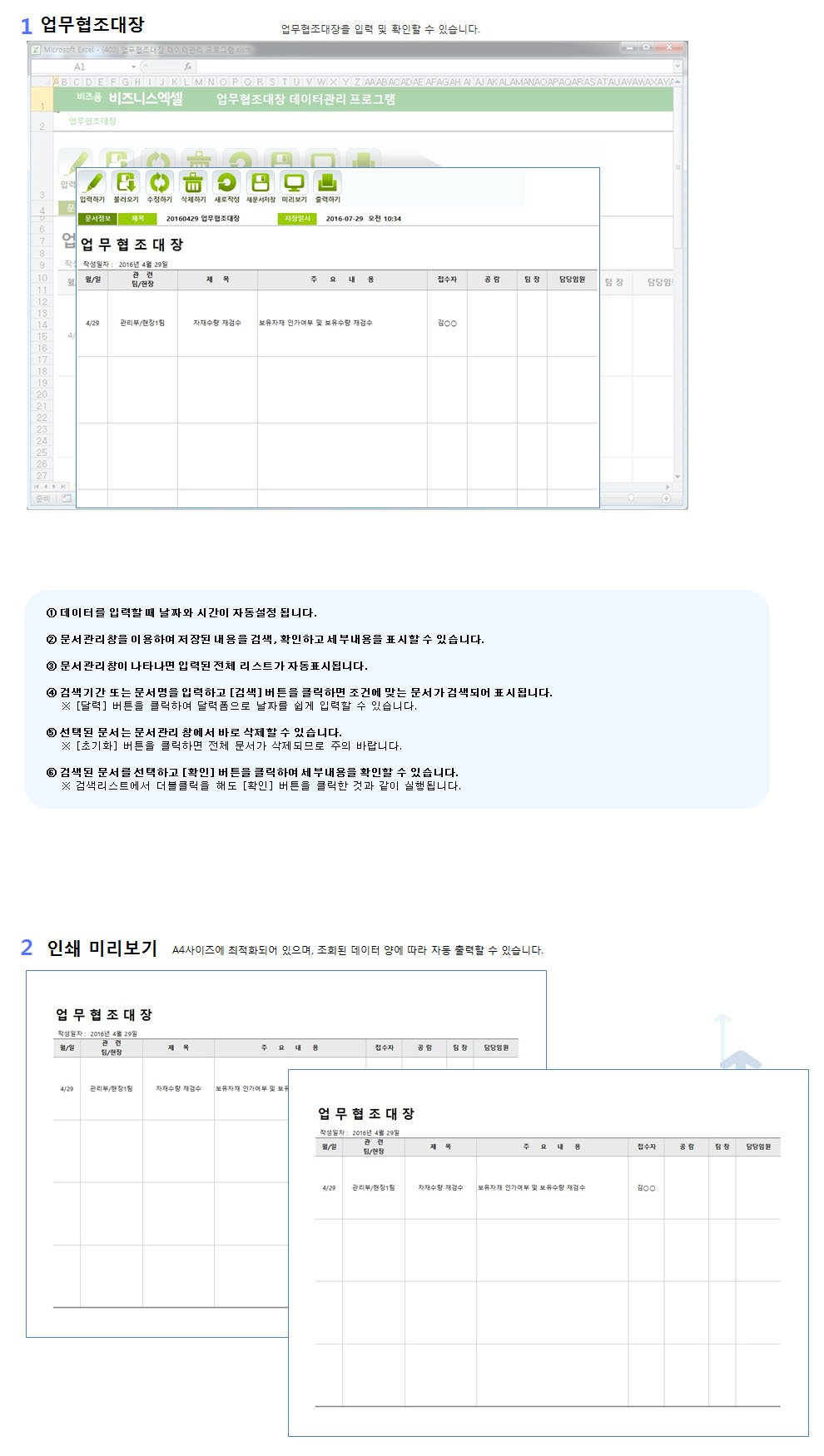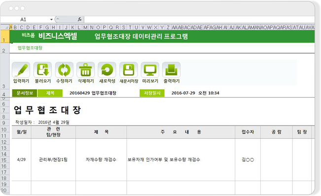 구성 : 업무협조대장■ 업무협조대장 데이터를 한곳에서 관리하는 업무자동화1. 반복적으로 입력하고 출력하는 업무를 저장/관리할 수 있습니다.2. 검색을 통하여 원하는 데이터를 불러와서 확인할 수 있습니다.3. 버튼 클릭으로 서식을 미리보거나 출력할 수 있습니다.4. 업무협조대장을 새로운 파일로 저장하여 관리하거나 메일로 보낼 수 있습니다.