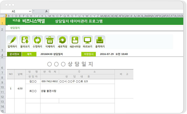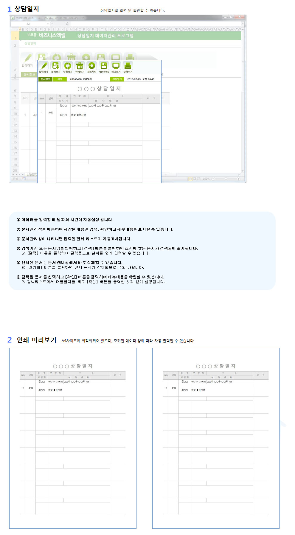 구성 : 상담일지■ 상담일지 데이터를 한곳에서 관리하는 업무자동화1. 반복적으로 입력하고 출력하는 업무를 저장/관리할 수 있습니다.2. 검색을 통하여 원하는 데이터를 불러와서 확인할 수 있습니다.3. 버튼 클릭으로 서식을 미리보거나 출력할 수 있습니다.4. 상담일지를 새로운 파일로 저장하여 관리하거나 메일로 보낼 수 있습니다.