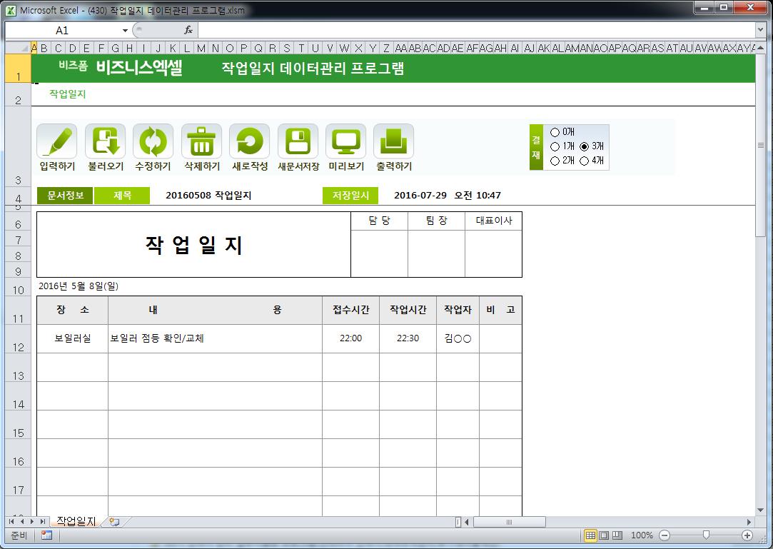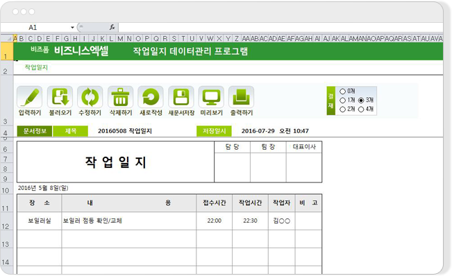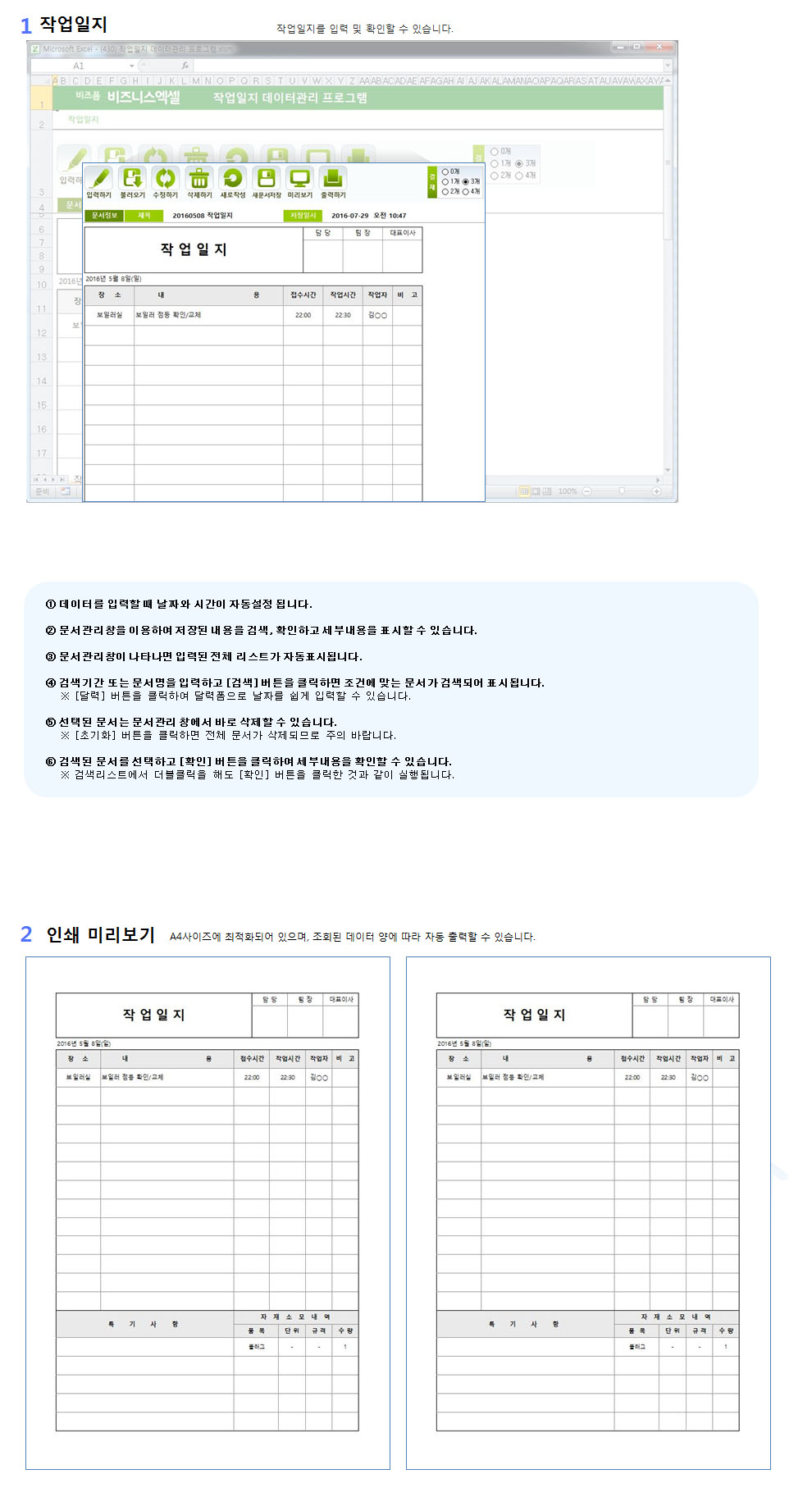 구성 : 작업일지■ 작업일지 데이터를 한곳에서 관리하는 업무자동화1. 반복적으로 입력하고 출력하는 업무를 저장/관리할 수 있습니다.2. 검색을 통하여 원하는 데이터를 불러와서 확인할 수 있습니다.3. 버튼 클릭으로 서식을 미리보거나 출력할 수 있습니다.4. 작업일지를 새로운 파일로 저장하여 관리하거나 메일로 보낼 수 있습니다.
