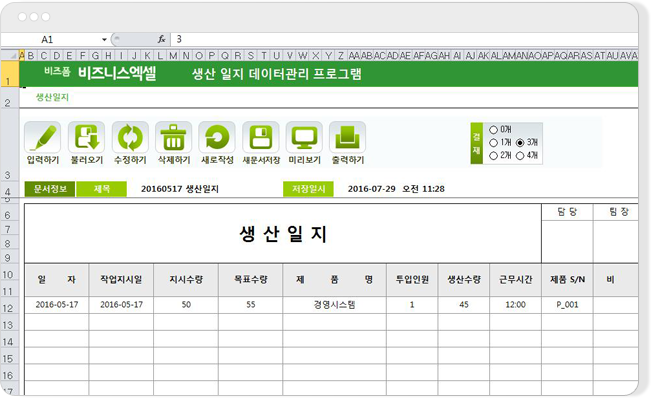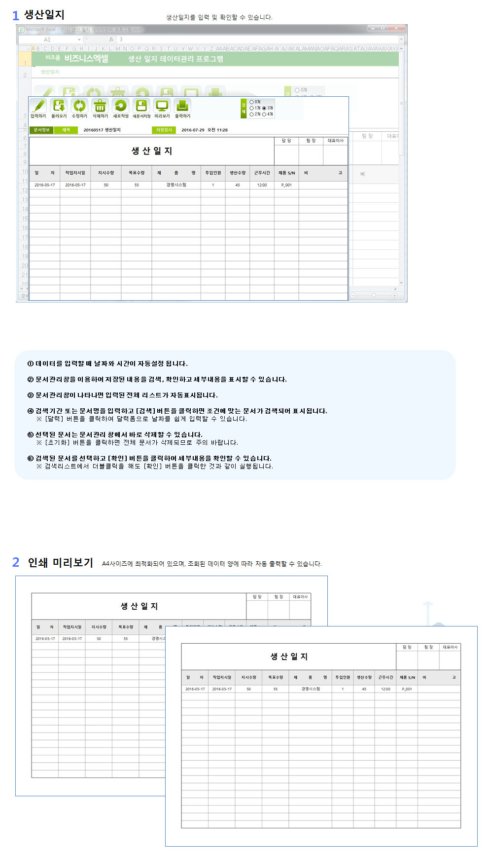 구성 : 생산일지■ 생산 일지 데이터를 한곳에서 관리하는 업무자동화1. 반복적으로 입력하고 출력하는 업무를 저장/관리할 수 있습니다.2. 검색을 통하여 원하는 데이터를 불러와서 확인할 수 있습니다.3. 버튼 클릭으로 서식을 미리보거나 출력할 수 있습니다.4. 생산 일지를 새로운 파일로 저장하여 관리하거나 메일로 보낼 수 있습니다.